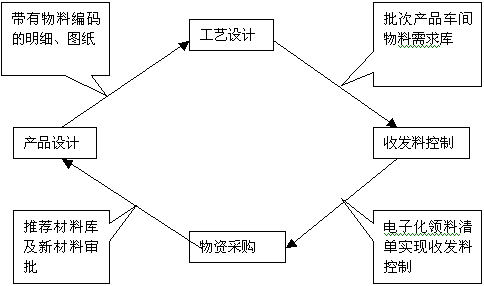 整个系统的业务管理核心之一是所有生产中涉及的物料信息在系统内闭环流动,物资部门、设计部门、工艺部门均可申请新物料,物料在经过批准后进入系统的循环。整个循环分为四个阶段: