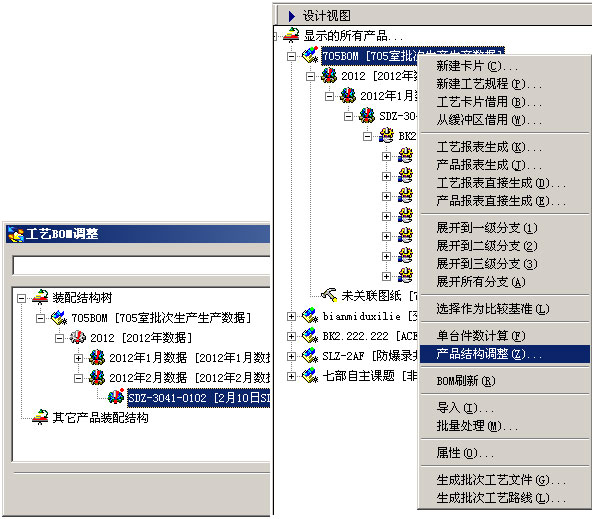 创建批次生产虚拟节点:选择批次生产虚拟产品,右键菜单“产品结构调整”,进入产品工艺BOM调整页面。