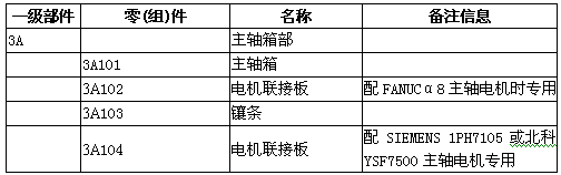 一级部件 零 (组)件 名称 备注信息 1A 床身部 1A301 运输紧固件 1A302 垫 1B 工作台部 2A 立柱部 3A 主轴箱部 3A101 主轴箱 3A102 电机联接板 配FANUCα8主轴电机时专用 3A103 镶条 3A104 电机联接板 配SIEMENS 1PH7105或北科YSF7500主轴电机专用 3A310 压盖 配FANUCα8主轴电机时专用 3A311 带轮 配FANUCα8主轴电机时专用 3A311-31 带轮 配FANUCα8主轴电机时专用 3A311-32 挡圈 3A313 带轮 配SIEMENS 1PH7105和北科主轴电机时专用 3A313-31 带轮 配SIEMENS 1PH7105和北科主轴电机时专用 3A314 压盖 配SIEMENS 1PH7105和北科主轴电机时专用 3A101-71 导轨贴面 1PH7105 主轴电机 根据用户或所配系统需要在三种电机中任选一种 FANUC α8 主轴电机 根据用户或所配系统需要在三种电机中任选一种 YSF7500 主轴电机 根据用户或所配系统需要在三种电机中任选一种 C40-1 胀紧联轴套 配FANUC α8电机时专用 C40-2 胀紧联轴套 配SIEMENS 1PH7105电机时专用 4B 冷却液箱部 配4D时取消此部 4C 气压管路部 4D 链板式排屑器部 配4B时取消此部 4R 润滑管路部